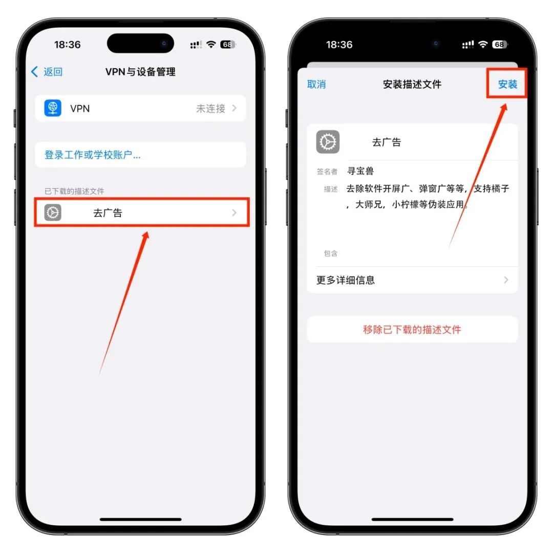 选择我们前面下载的描述文件,点击进去,选择【安装】,安装完成之后,会自动启动广告屏蔽功能,无需其他操作,当你不需要的时候也可以直接卸载该描述文件。