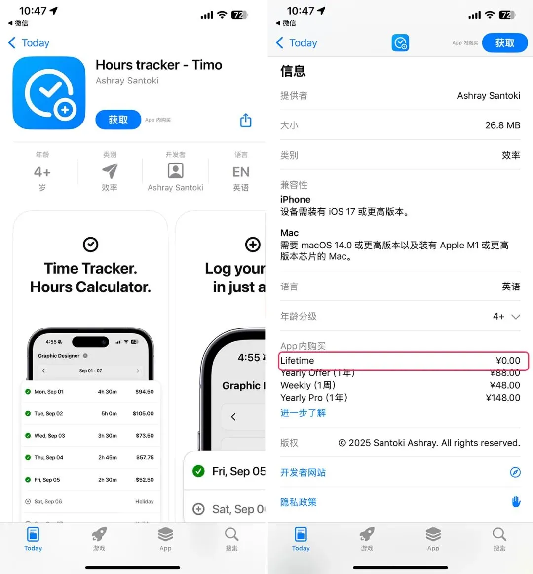 介绍:一款面向自由职业者、小时工的工时与收入追踪效率应用,可记录多任务时薪、加班 / 小费,自动算薪,按周 / 月 / 年生成报表并导出 CSV。