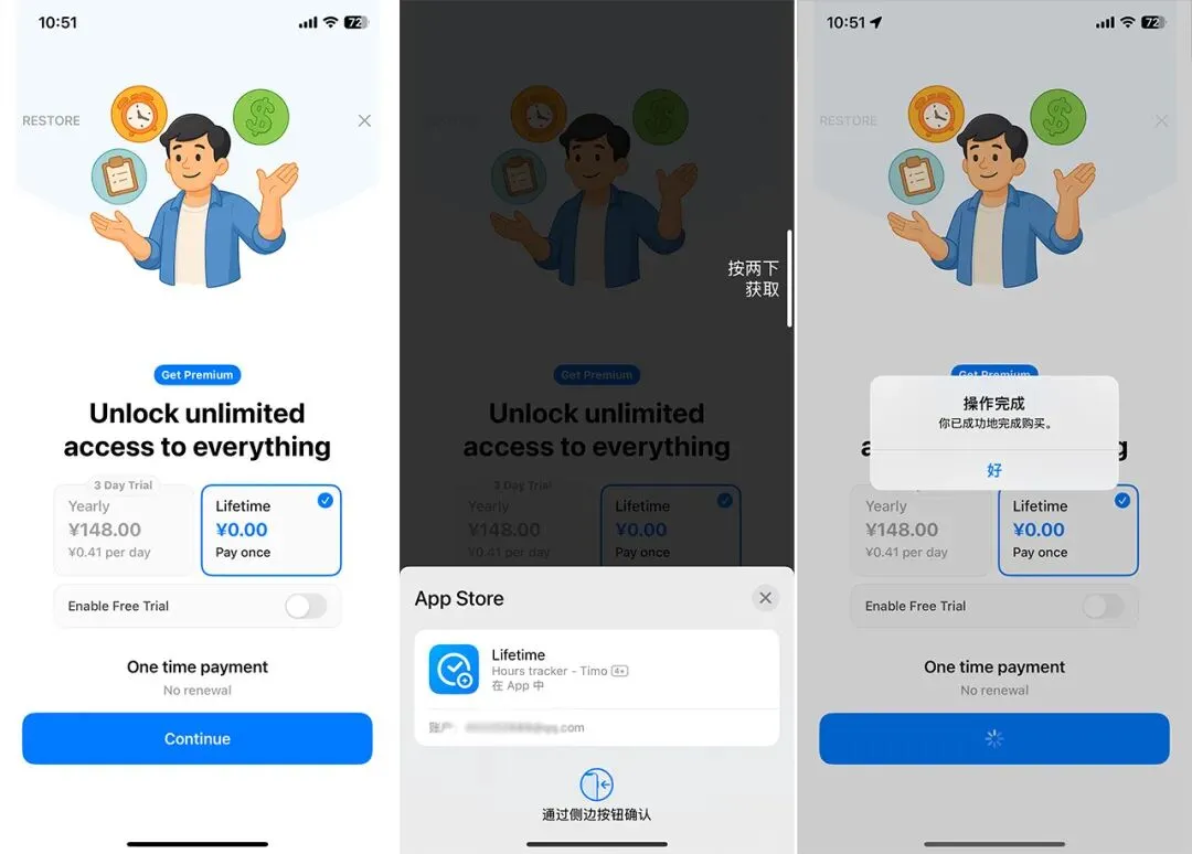 2,内购界面,选择 Lifetime¥0.00 选项,点击底部按钮进行购买。