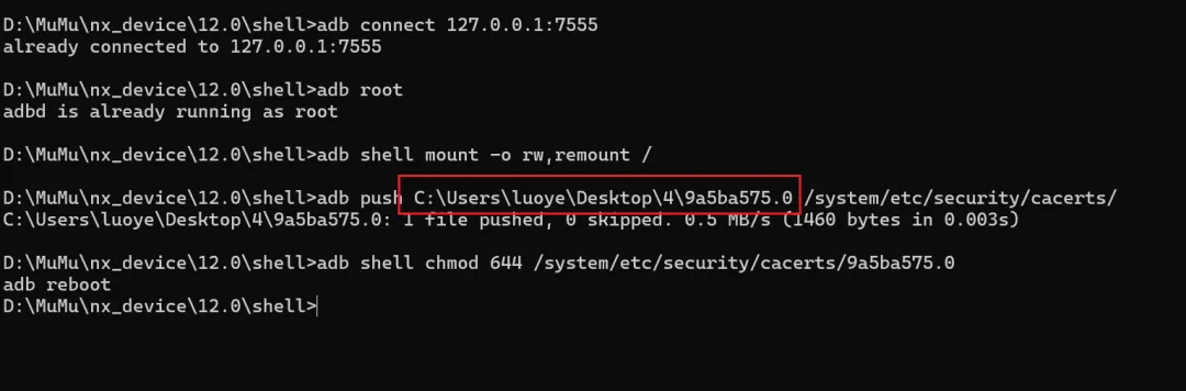 接下来我们将cacert.pem 重命名为 9a5ba575.0(注意后缀是 .0)这里我们回到模拟器,在设置的关于手机里面点击5下版本号开启开发者选项这里我们需要找到我们MuMu安装模拟器的位置,这里有个adb.exe比如我的路径是 D:\MuMu\nx_device\12.0\shell# 连接模拟器adb connect 127.0.0.1:7555# 提权adb root# 挂载系统为可写 (解决报错的关键一步!)adb shell mount -o rw,remount /# 推送证书到系统目录adb push 9a5ba575.0 /system/etc/security/cacerts/# 赋予权限并重启adb shell chmod 644 /system/etc/security/cacerts/9a5ba575.0adb reboot
