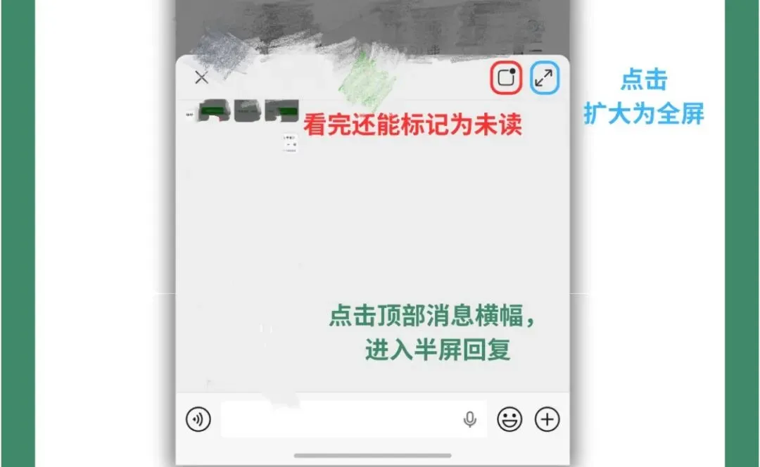 从页面上我们可以看到,不仅能半屏直接回复,看完还可以标记未读稍后回复,如果觉得屏幕太小,也可以扩大为全屏,微信更新的这个功能是真的用心了。