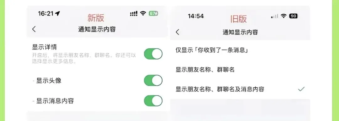 不仅如此,原先通知显示内容设置在更新后也变成了「显示消息内容」与「显示详情」这种独立控制的开关了,细节拉满了啊。