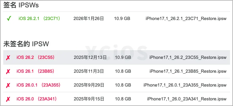 苹果在前段时间发布了 iOS 26.2.1 正式版系统之后,就在今天,苹果宣布正式关闭 iOS 26.2 正式版系统验证,这代表用户只有 iOS 26.2.1 正式版可选。而本次苹果这么快就结束 iOS 26.2 系统的主要原因还是此版本存在严重的安全漏洞,苹果呼吁用户尽快更新到 iOS 26.2.1 或者其它最新版本中。从此前我们发布的 iOS 26.2.1 正式版续航测试来看,此版本相对来说还是一个不错的版本,大部分型号在固定测试中都有不错的续航表现,没有看的朋友也可以去看看。当然了,无论是好与坏,目前我们可以选择的正式版本也就只有 iOS 26.2.1 了,其它版本的验证均已关闭,无法降级回去。