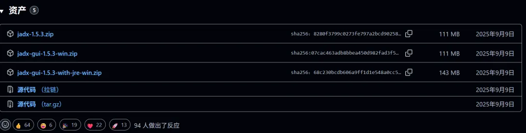 JAVA下载链接:https://www.oracle.com/cn/java/technologies/downloads/1. 获取安装包:前往 GitHub 的 Releases 页面下载最新版。(注:如果你担心 GitHub 访问慢,可以在后台回复【JADX】获取网盘下载链接)JADX下载链接🔗: https://github.com/skylot/jadx/releases/tag/v1.5.3jadx-gui-1.5.3-with-jre-win.zip - 包含 JRE 的 jadx-gui 版本