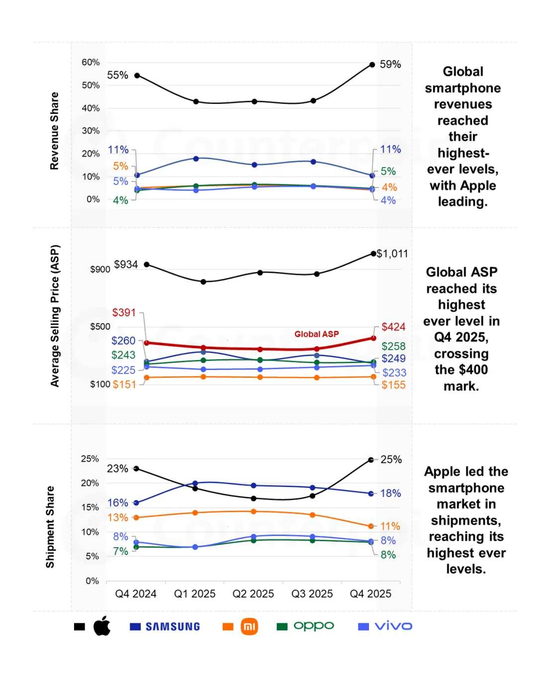 近日,著名Counterpoint数据显示2025年第四季度苹果均价超1000美元,而安卓阵营仅仅为200多美元,其中,三星249美元,oppo258美元,vivo233美元,小米155美元,仅苹果一家公司就吃下了几乎整个市场的利润。在全球市场中,我们仅仅能看到苹果,三星,oppo,vivio,小米的均价,然而华为在中国市场占据四分之一,华为的均价是多少呢?在公开的数据中我们无法得到华为的均价,但我们可以通过侧面计算出:2026年一月华为Mate80系列销售量约108万台,Nova15约60万台,Pura80系列销量约40万台,mate70系列约35万台,matex6系列约12w台,畅想80等其他机型约10万台。Mate80系列中标准版占70%,价格约4699,其他的的我们按最低版本价计算5999,nova15按最低市场价格2600元计算,Pura80按最低价格4200计算,mate70按低价4100元计算,matex6按最低9900元计算,畅想等按800元计算,那么我们可以计算得:108*0.7*4699+108*0.3*5999+60*2600+40*4200+35*4100+12*9900+10*800/(108+60+40+35+12+10) = 4316.6以上的计算都是按照最低价格计算,实际平均价格大概高于以上价格。得出华为26年1月的平均价格约4316元,这些价格是没有加上国补的,如果算上国补,实际价格也接近4000元。目前华为的低端机还没有发力,所以在机型方面大量供货的均为中高端,如此华为的均价大概4000元以上,是苹果之外最高的,也是所有品牌中最能给苹果压力的。可惜的是华为目前在国际市场上处于缺位状态,按照之前国外价格高于国内的定价策略,如果国际市场能打开,华为的平均价格大概是能达到5000元,虽然可能无法达到苹果的价格,但无可置疑的是妥妥的高端远超一众安卓厂商。