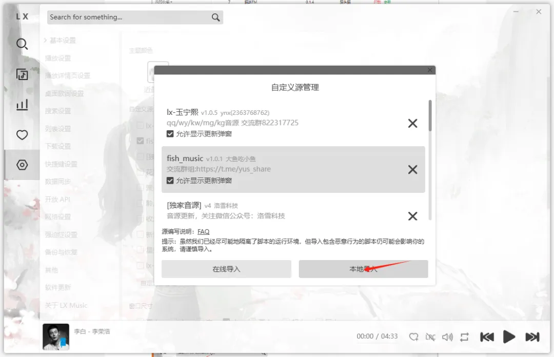 很多小伙伴休闲时光都喜欢刷刷抖音,听听音乐,但是又苦于很多音乐需要vip,而且各个平台需要充值不同的会员,加重了休闲娱乐带来的经济负担,今天就给大家两个免费的音乐软件。 两个软件均为github开源项目,按照安装包名称直接搜索就可以找到对应的主页。 该软件仅有Windows版本,安装完成后,需要在插件管理中导入我提供的音源才可以正常使用。 该软件支持Windows和安卓版本,也是需要导入音源才可以使用。 一次只能导入一个音源,建议将我提供的所有音源都导入,不可用的节点他会自动切换。 本期介绍的2款免费音乐软件到这里就介绍完毕了,后台回复“免费音乐”获取软件及音源下载地址。