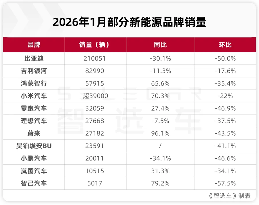 “老大哥”比亚迪1月以210051辆的成绩继续位居榜首,仍是唯一月销超20万的新能源车企,但这份成绩单的背后也有担忧,同比下滑30.1%,环比更是腰斩。