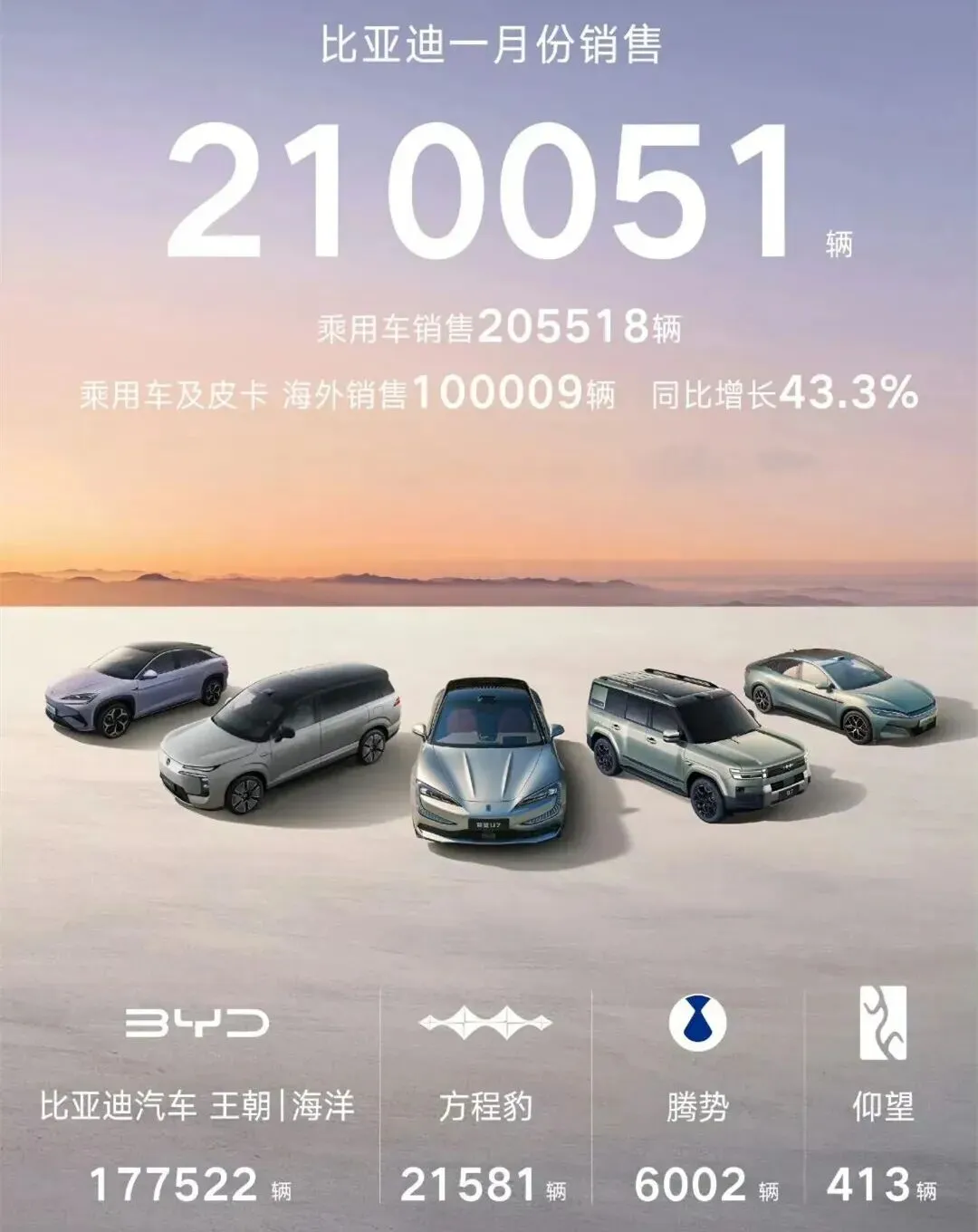 值得注意的是,比亚迪国内销量约11万台,比去年1月下降30.67%,反倒是海外市场撑起了半边天,乘用车及皮卡出口约10万台,同比增长43.3%。