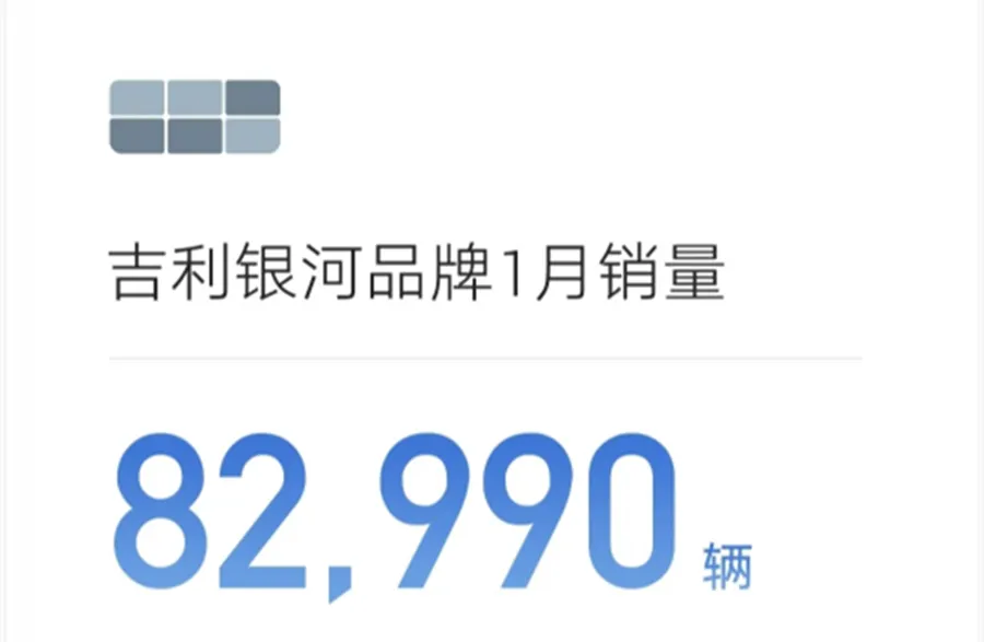 吉利银河算是传统车企里的新能源尖子生。1月份卖了82990台,虽然同比微降11.3%,但在吉利汽车内部仅次于中国星系列,并且达成了累计销量和用户破百万的成就,是行业里最快达成这一成就的新能源品牌。
