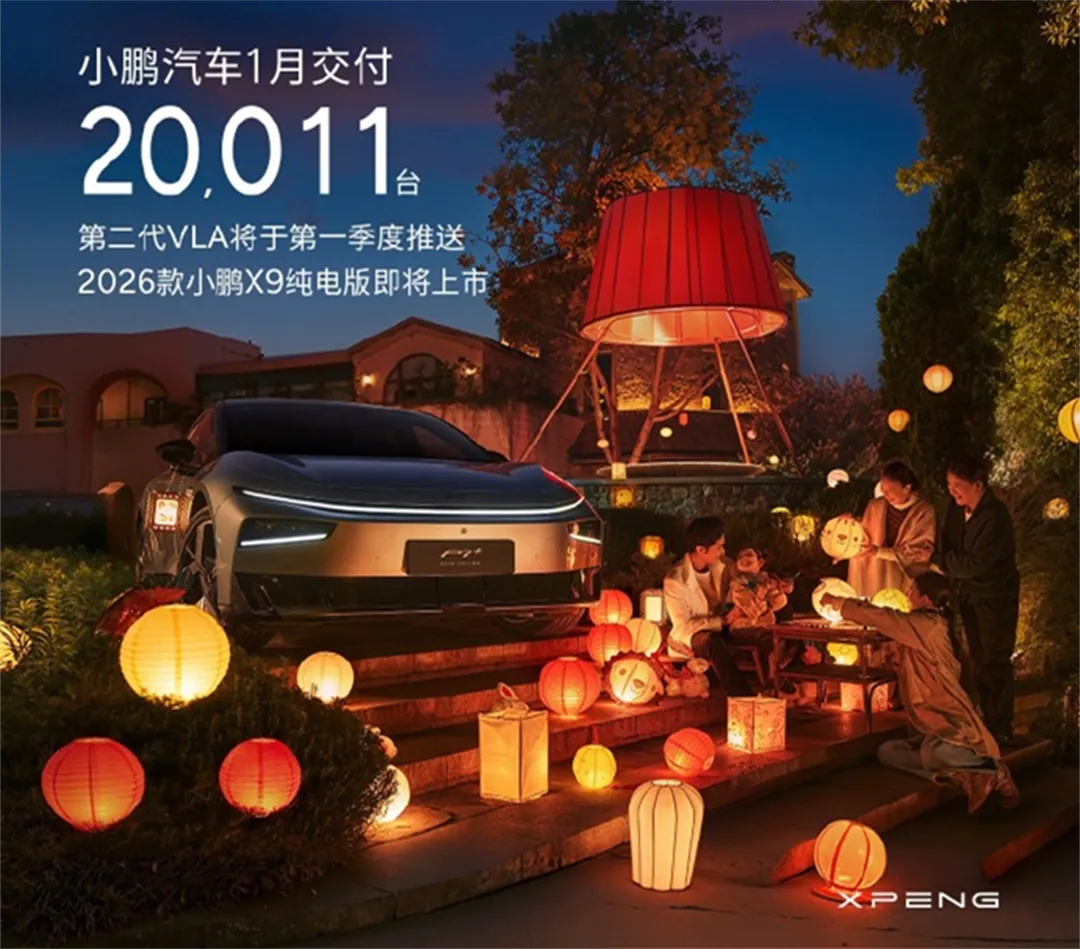 小鹏汽车1月有点“马失前蹄”,交付量20011台,同比下降34.1%,环比下降46.6%,即便1月初一口气推了2026款P7+/G6/G7/G9四款新车,也没能扛住政策冲击。