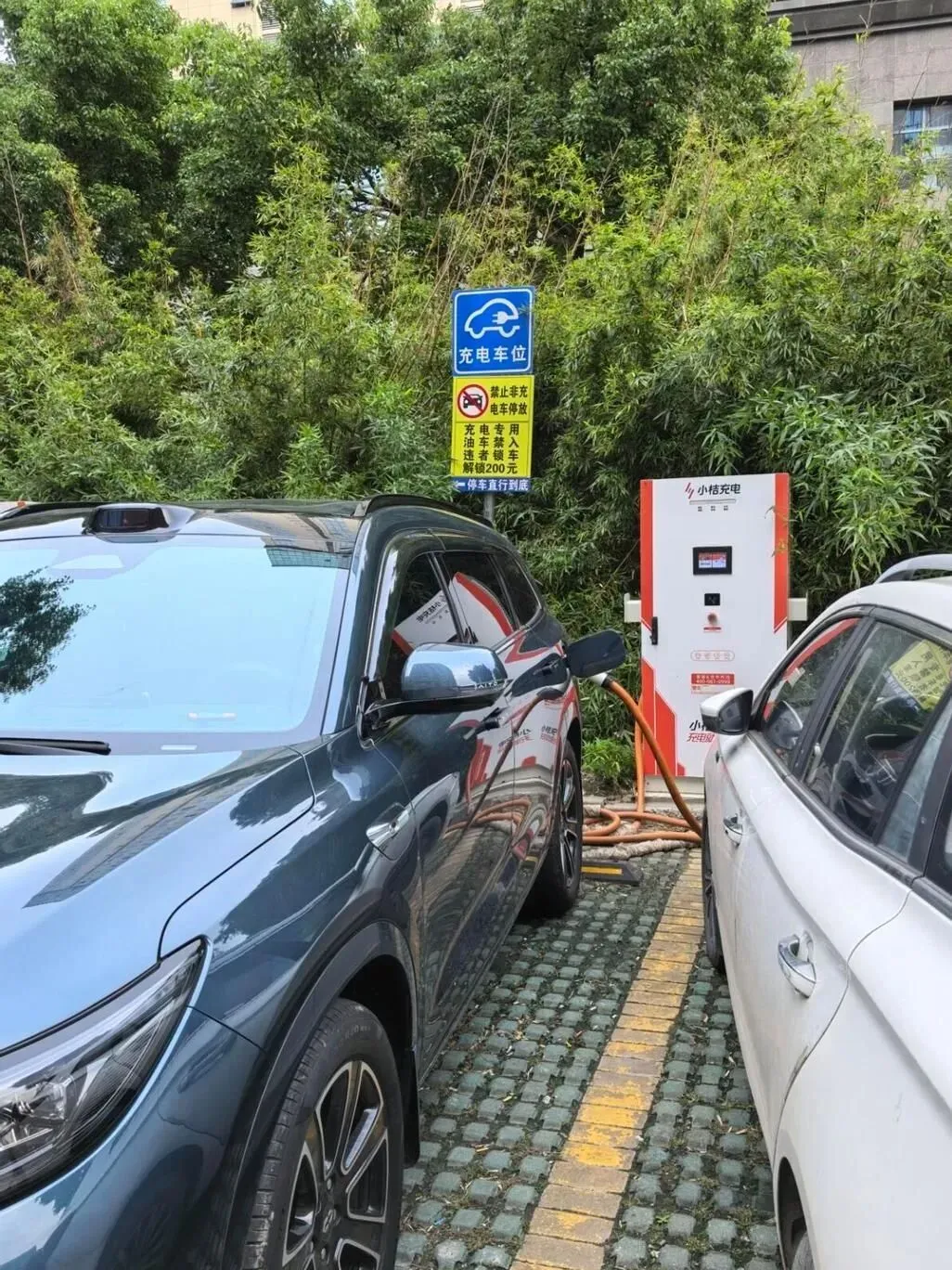 我现在站在门口拍几张外景,能看到外面还有几辆车排队.充.电,不.过已经加了一.个牌子——“仅限预约车主使用”。我觉得这就挺合理的,把资源.留给真正用车.的人,不然最后大家都没.得玩。