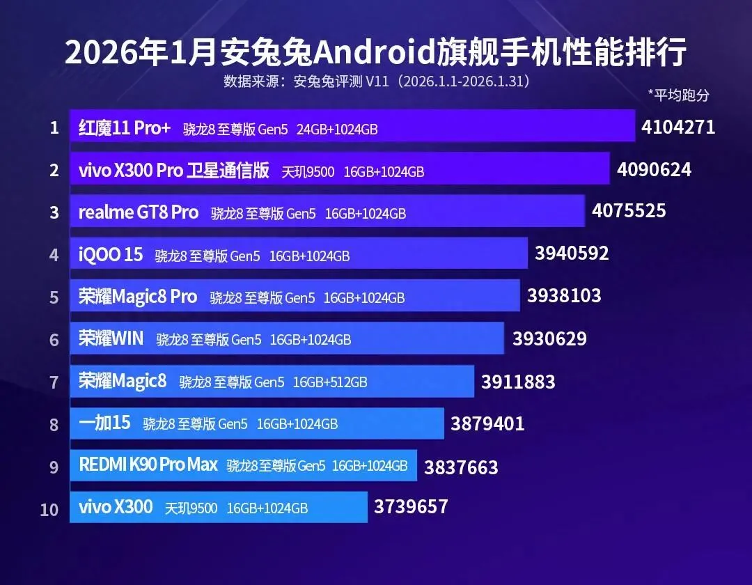今天分享的是2026年1月安兔兔安卓旗舰手机性能榜:和12月份性能榜相比,不论是上榜的机型,还是它们之间的排名变化还是挺大的,这也是该榜单值得分享的原因之一。如果按芯片分组的话,其中有8款为骁龙8Elite机型,搭载天玑9500芯片的机型仅有2款上榜,以下是榜单的详细内容。
