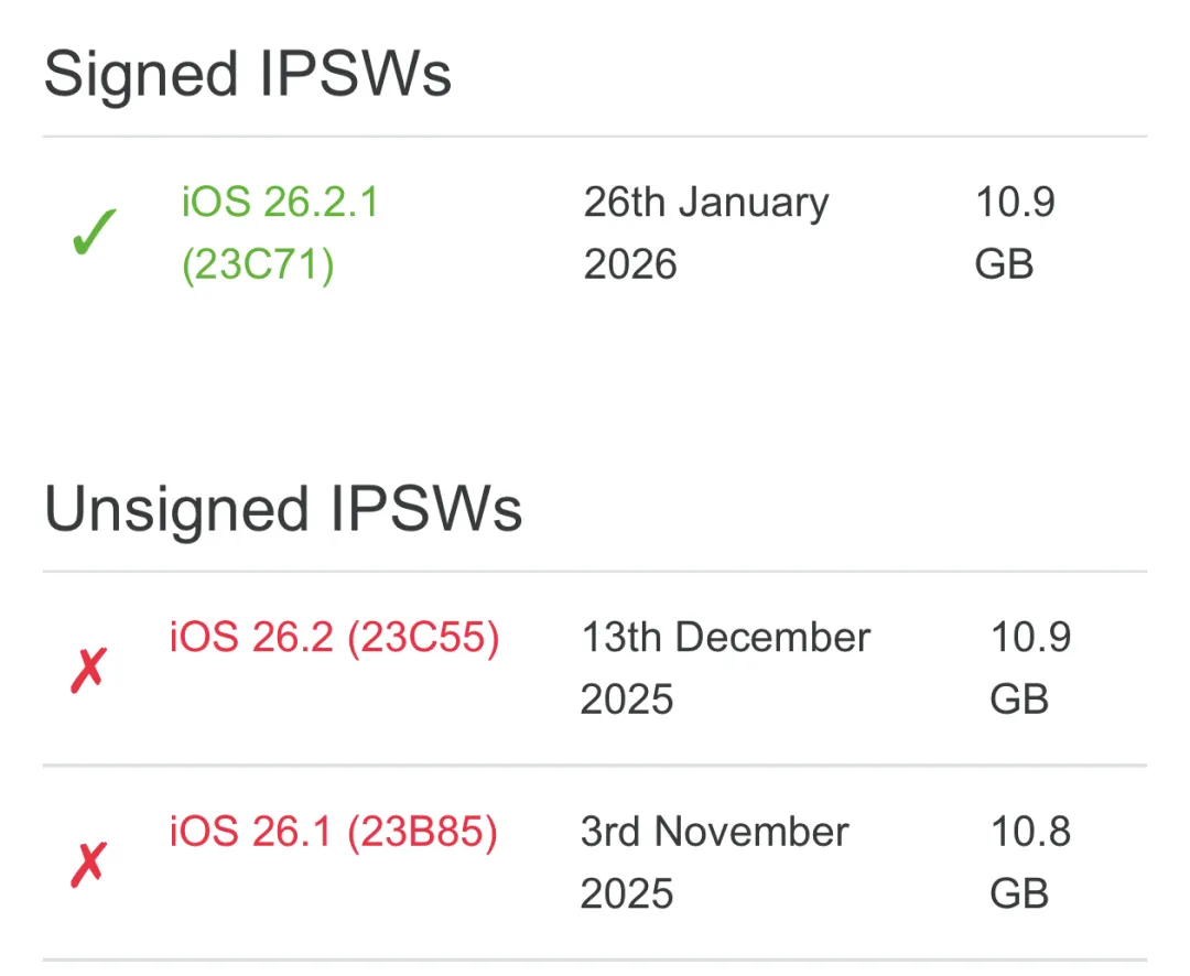 验证通道的关闭也就意味着已经升级了 iOS 26.2.1 正式版的设备无法刷机降级到 iOS 26.2 正式版,现在可以选择的版本就是