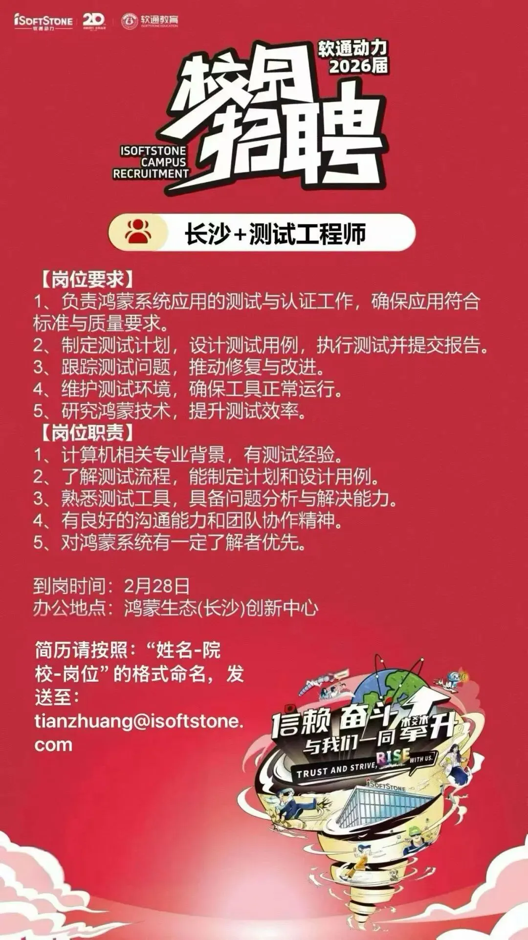 号外号外:鸿蒙测试岗位,base地长沙,支持应届生