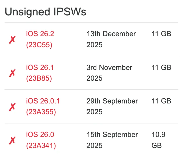 苹果关闭 iOS 26.2 正式版的验证通道!