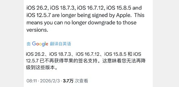 在2月3日上午时段,苹果关闭多个 iOS 系统验证,包括 iOS 26.2、iOS 18.7.3、iOS 16.7.12、iOS 15.8.5 和 12.5.7 系统,让你无法刷入这些系统版本。
