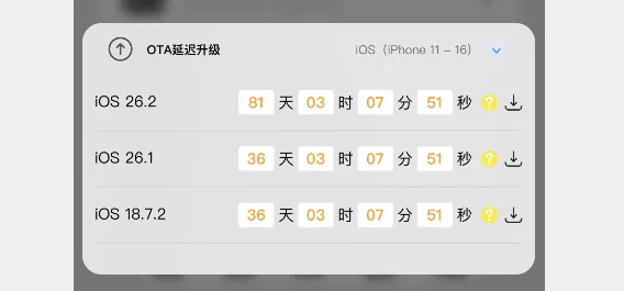 不过!低版本系统还能升级,可以通过OTA延迟升级的方法升级,但是大于 iOS 26.2 系统的设备就没办法降级了。