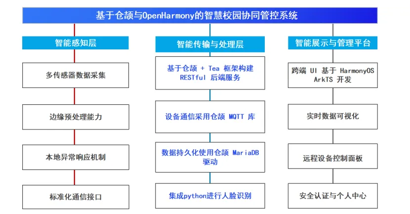 在数字化浪潮席卷教育行业的今天,智慧校园建设已成为高校提升管理效率、优化师生体验的核心方向。然而,传统校园管理中普遍存在环境监测滞后、设备控制不便、教室状态难感知等痛点,且多数系统依赖国外技术栈,存在安全隐患与适配难题。为此,我们团队以国产化技术为核心,打造了基于仓颉语言与 OpenHarmony 的智慧校园协同管控系统,用自主可控的技术方案破解校园管理痛点,为高校提供高效、安全、智能的管理新范式。