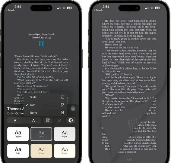 苹果重新恢复了Apple Books“图书” 翻页功能,现在有 卷曲、侧面 和 无 三个翻页选项,可以更好的满足用户偏爱需求。