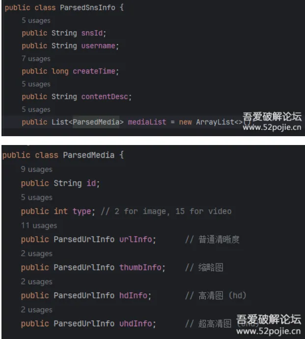 我们只需要每条朋友圈的发布日期,朋友圈文本,以及各图片的Url。