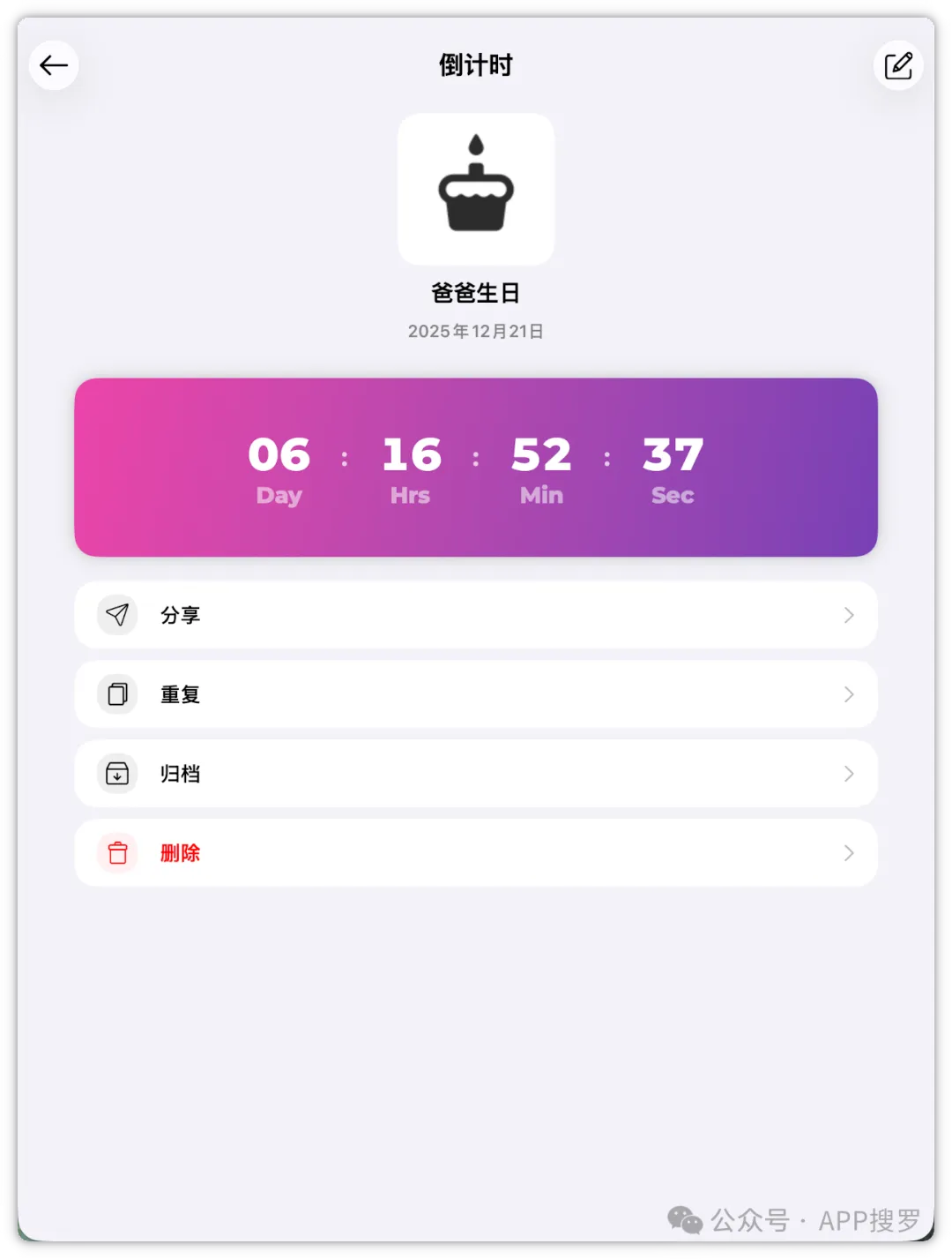 接下来给大家介绍下这款APP的价值,平时我们会有很多重要的事情需要记录,比如父母妻子孩子的生日,每月的水电费或者公司的重要事项,而这款APP就是一款设计精美的倒数计时软件,它能轻松解决你总是错过重要约会、忘记生日或错过截止日期的困扰。