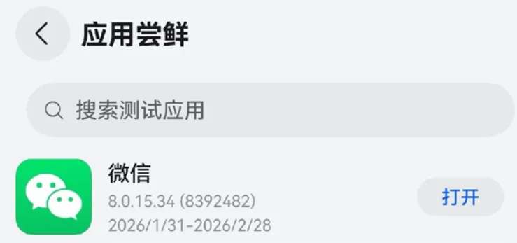 打开华为应用市场,点"我的",找到"应用尝鲜",里面应该能看到微信鸿蒙版8.0.15.34,直接点升级就行。如果懒得找,直接搜索"微信",看到"尝鲜版"入口也行。你的手机得是HarmonyOS 5.0及以上系统,太老的机型就别折腾了。