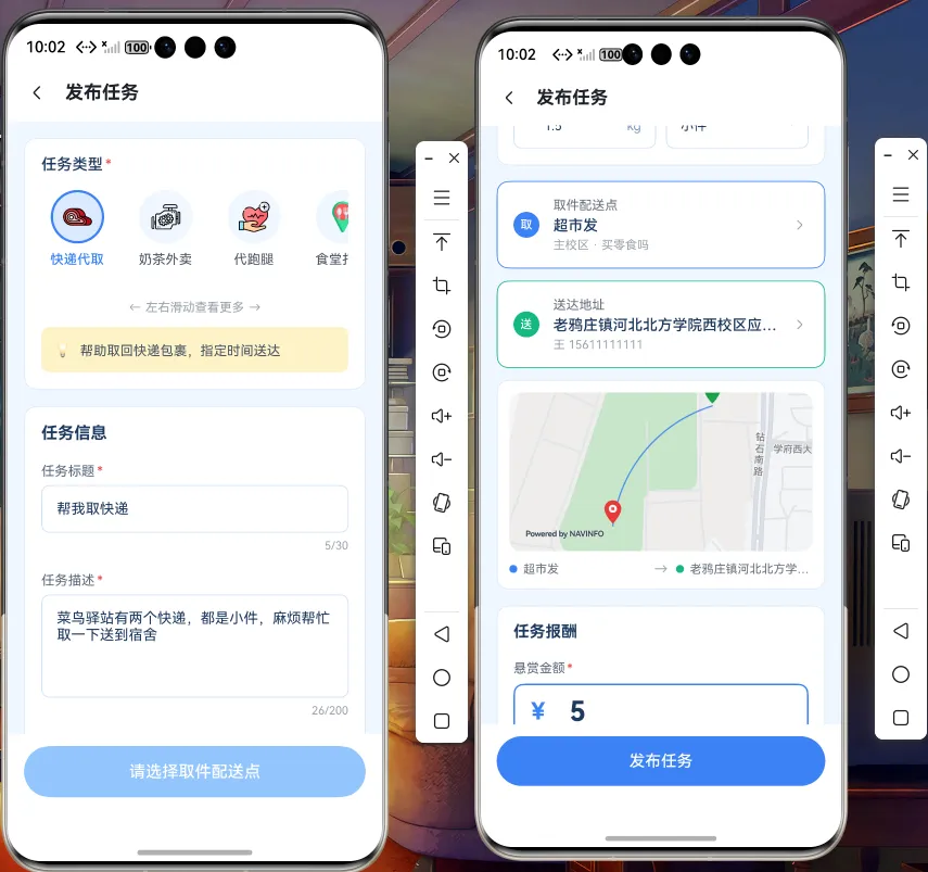 ★ 丰富的任务类型 - 快递代取、食堂打饭、商品代购、排队占座等多种校园场景,贴近实际需求(36+种任务类型)