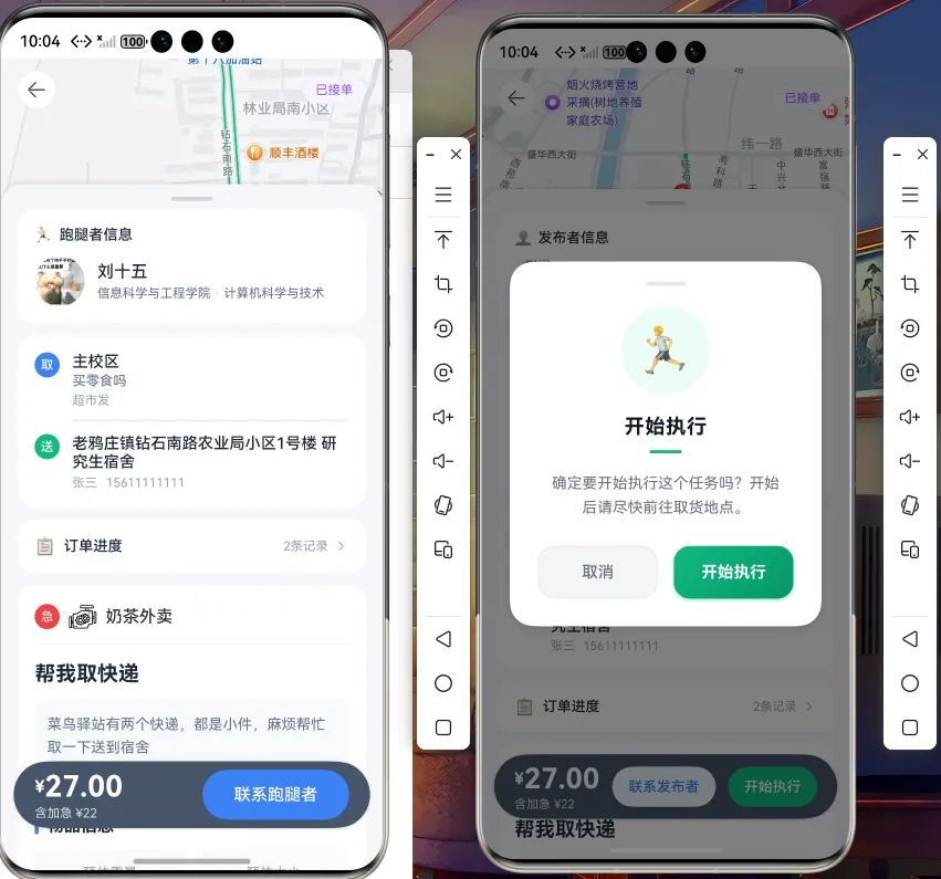 ★ 双角色设计 - 学生用户可同时作为发布者和跑腿者,角色灵活切换,一个账号两种身份,增加系统互动性和实用性