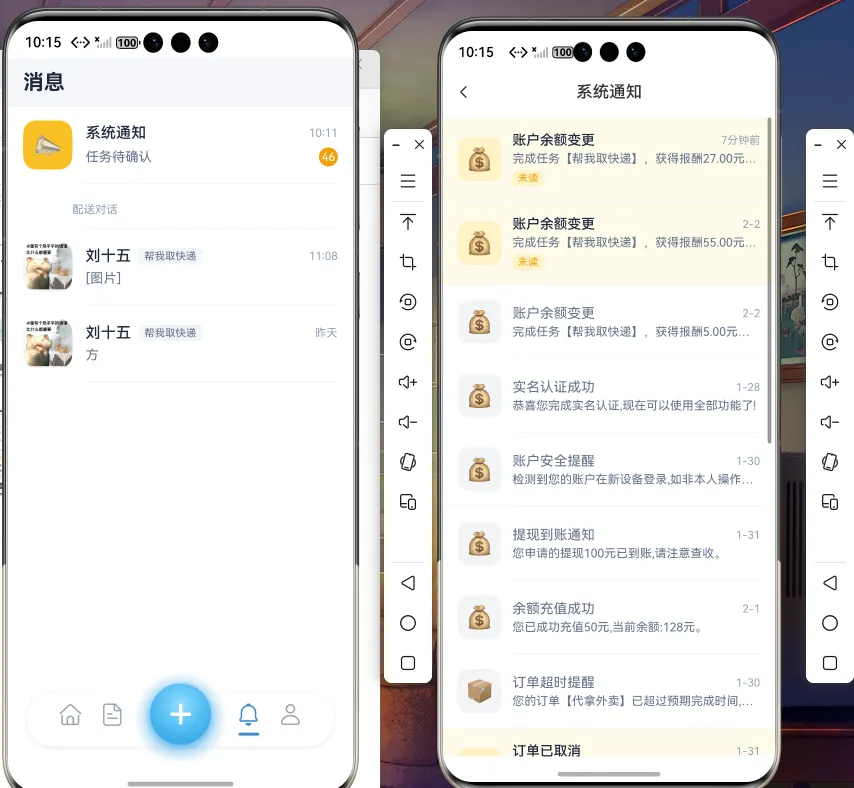 ★ 完整的余额系统 - 发布者充值支付报酬,跑腿者赚取收入提现,完整的资金流转闭环,包含充值、提现、收支记录