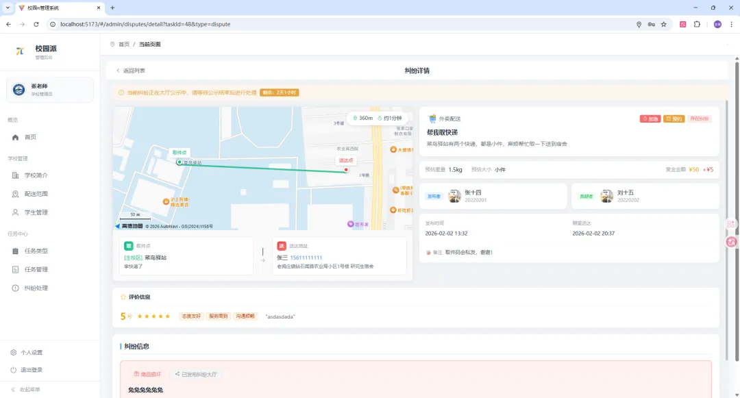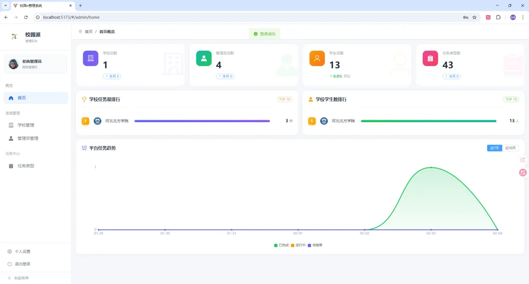 - 管理本校学生信息、管理任务类型、处理纠纷、查看数据统计、批量导入学生