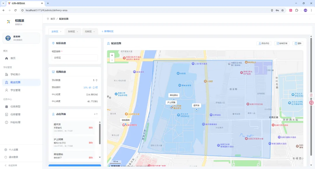 配送区域管理: 绘制校区配送范围(多边形),管理POI取件点
