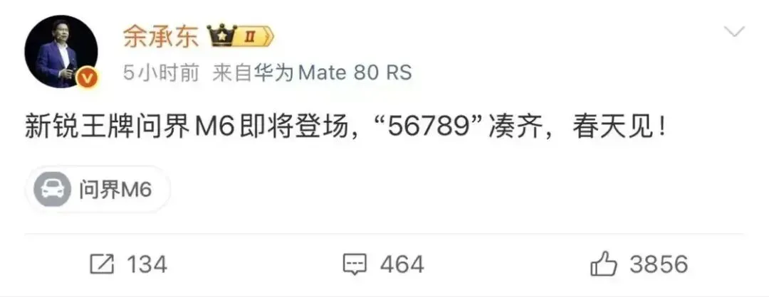 产品矩阵布局与竞争力差异,造就了“五界”品牌的两极分化,这也是鸿蒙智行1月销量的最突出特征。问界品牌成为绝对增长引擎,1月交付40016台,同比增长83%,占鸿蒙智行整体交付量的69.1%,相当于每10台交付车辆中就有7台来自问界,其强势表现得益于成熟的产品矩阵与华为核心技术赋能。华为常务董事、终端BG董事长余承东在微博发文透露,问界M6即将登场,将补齐“56789”产品序列,进一步覆盖主流到高端市场,为后续增长蓄力。同时,问界聚焦大电池增程车型,将纯电续航优化至更贴合市场需求的区间,契合2026年增程车型异军突起的行业趋势,成为其抵御市场波动的核心底气。