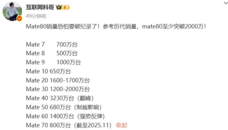 华为最新推出的Mate 80系列,搭载了性能较强的麒麟9030芯片,并且其销量还突破了214.55万台。