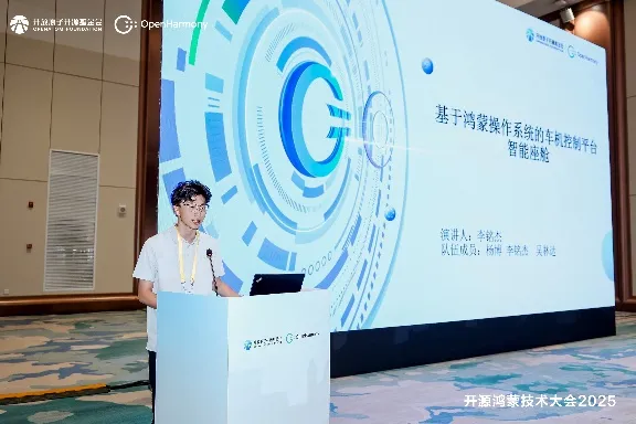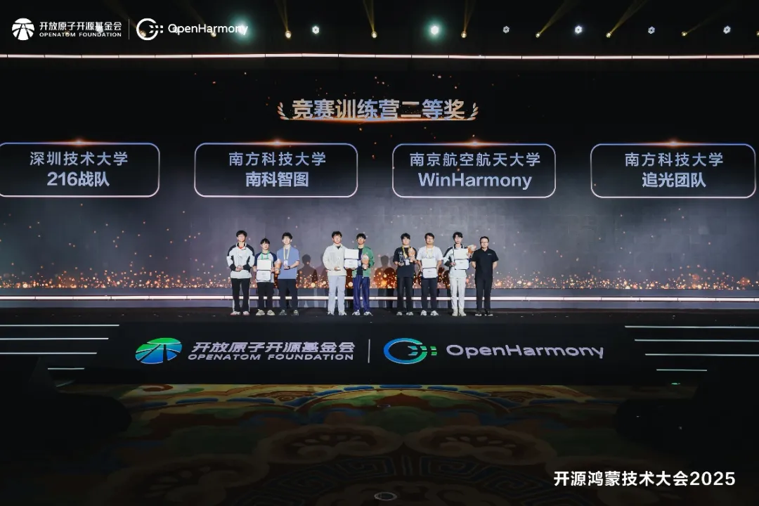 在课程学习之余,我也跟随协会参与了开源鸿蒙技术大会,我们团队“216战队”的作品“基于鸿蒙操作系统的车机控制平台智能座舱”也亮相了此次大会,并且获得了开源鸿蒙2025年度竞赛训练营二等奖,与此同时开源鸿蒙开发者协会被授予了“领航开源鸿蒙开发者协会”称号,李蒙老师被授予了“开发者协会星光导师”称号。