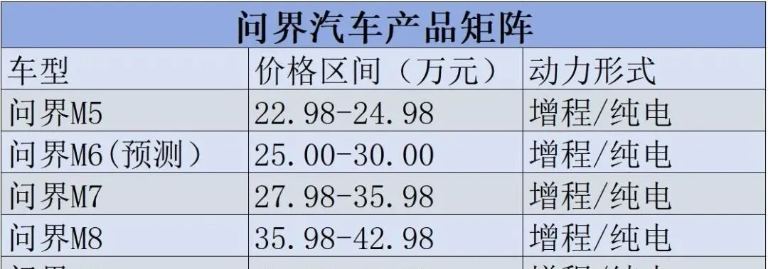 华为余承东最近官宣了问界家族的新成员——M6,这款新车定位25万-30万元区间,提供增程和纯电两种动力选择,3月初就能开启小定,预计今年第二季度正式上市。它的到来刚好补上了问界M5(22.98万起)与M7(27.98万起)之间的价格空档,让问界“56789”的产品矩阵终于完整凑齐。