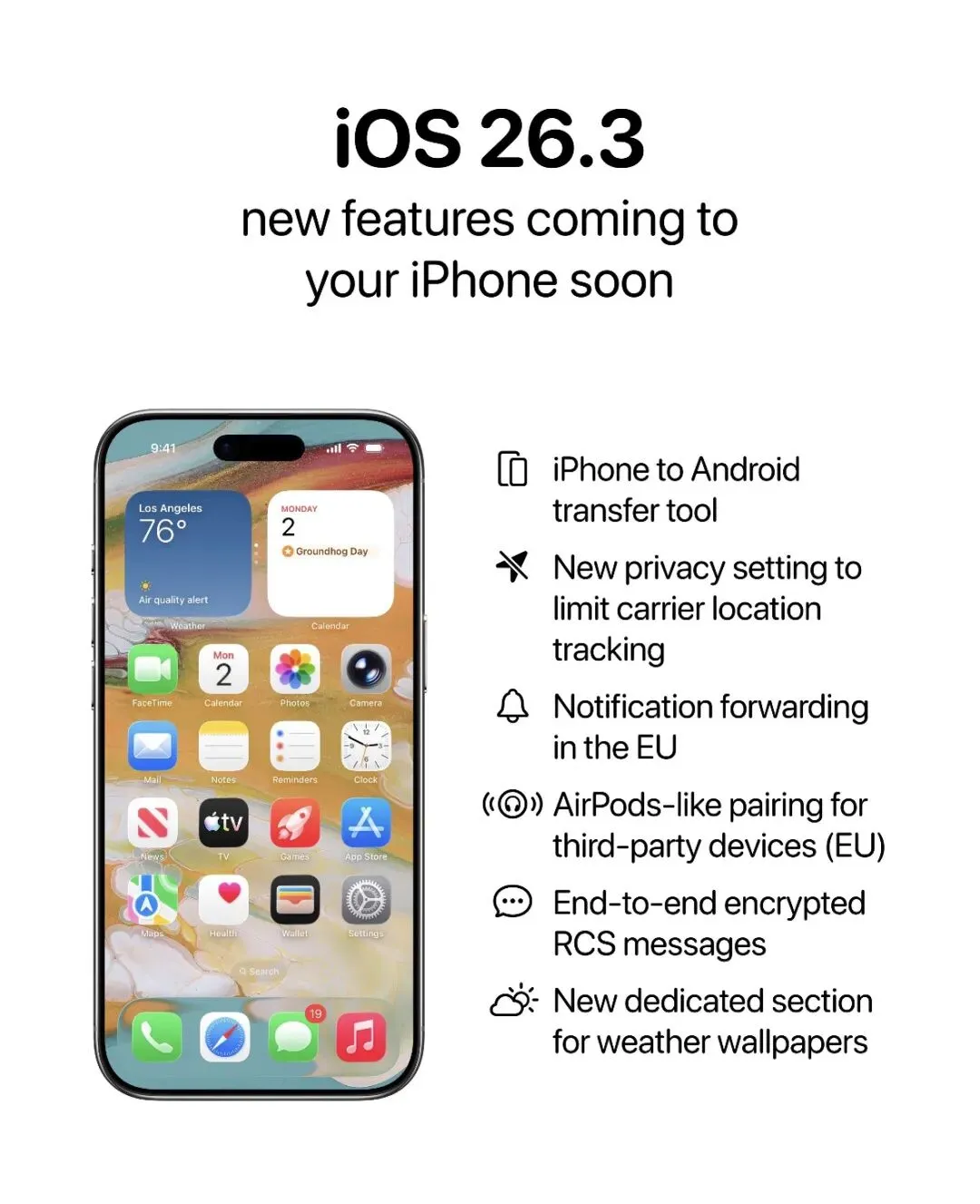 不过还是要给大家提个醒,iOS26.3目前还是测试版,虽然整体表现不错,但部分机型可能会出现小问题,比如有用户反馈个别应用闪退、电池电量显示不准等情况。如果你的手机是日常办公、接打电话的主力机,建议再等等2月上旬的正式版,稳定性更有保障;如果想提前尝鲜,也可以等本周推出的RC版,这个版本的bug已经基本修复,和正式版差别不大,踩坑风险更低。