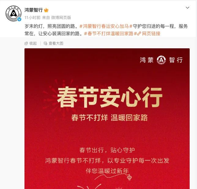 鸿蒙智行官方宣布推出春节安心行活动,宣称“春节不打烊”,支持新春出行检测、24 小时全场景道路救援等,活动时间为 2 月 4 日-3 月 3 日。