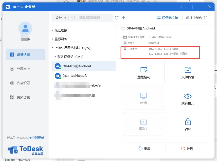 在远程会话中,新增显示安卓被控设备的局域网IP地址信息。这一细节优化帮助运维人员快速、准确地识别设备在网络中的具体位置,尤其在处理网络配置、定位IP冲突或进行内网拓扑管理时,提供了至关重要的信息参考,避免了混淆与误操作。