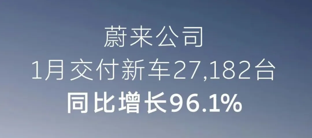 蔚来公司1月交付27182辆,同比增长96.1%。这一增长主要得益于全新ES8的强势表现,该车型单月交付约1.76万辆,占蔚来总销量的65%。