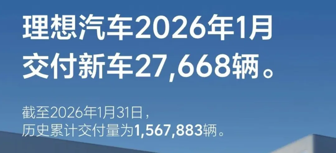 理想汽车1月交付27668辆,同比下降7.55%,环比下降37.47%。理想汽车曾表示,受限于电池供应,纯电SUV i6与i8等车型产能爬坡进度不及预期。
