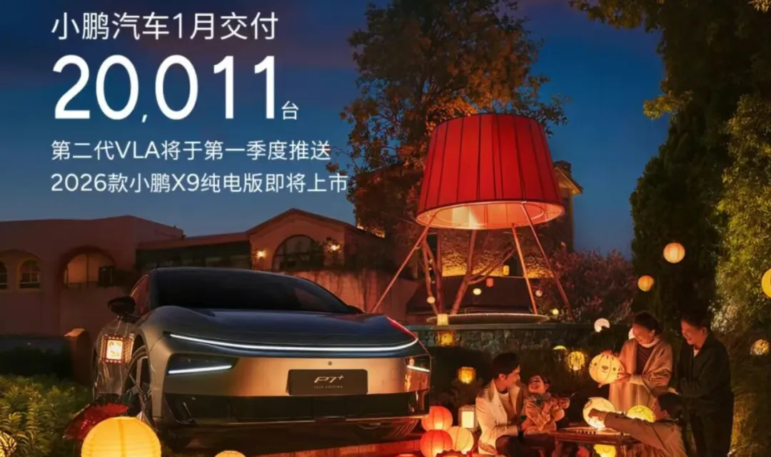 小鹏汽车1月交付20011辆,同比下降34.07%,环比下降46.65%。1月8日,小鹏汽车发布了2026款小鹏P7+、G6、G9、G7超级增程车型。不过小鹏X9表现亮眼,1月交付4219辆,同比增长413.9%,成为国内新势力MPV中累计交付最快突破5万辆的车型。