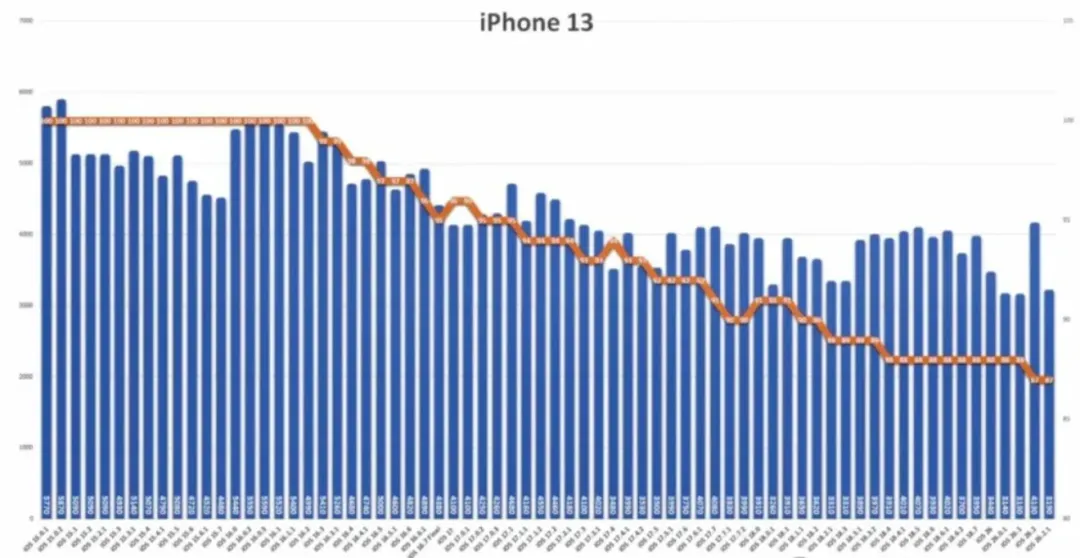 尤其是 iPhone 13,它的电池得分下降幅度最大,说明新系统在这个机型上的能效管理策略完全失效了,或者是苹果有意为之的“负优化”,逼着你去换新机。