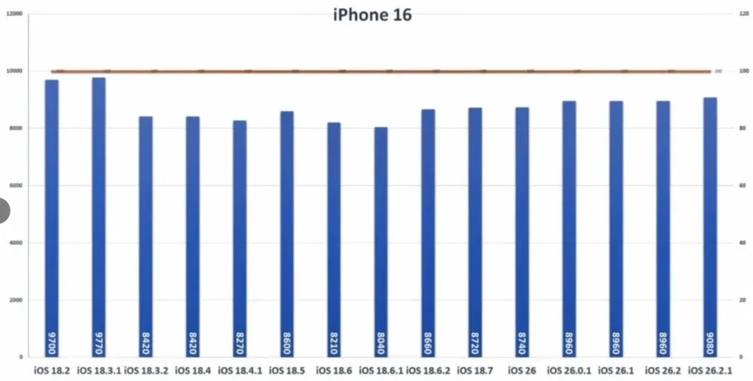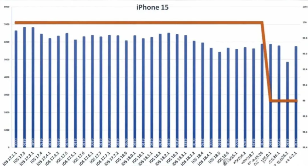 iPhone 13:iOS 26.2 版本还有 4130 分,升级到 26.2.1 后直接暴跌至 3190 分。