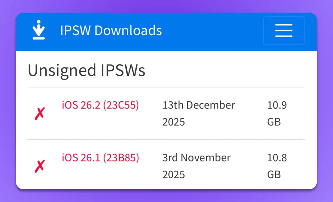 除此之外,苹果还停止了一些旧版系统的验证,其中包括:iOS 12.5.7、iOS 15.8.5、iOS 16.7.12 和 iOS 18.7.3。