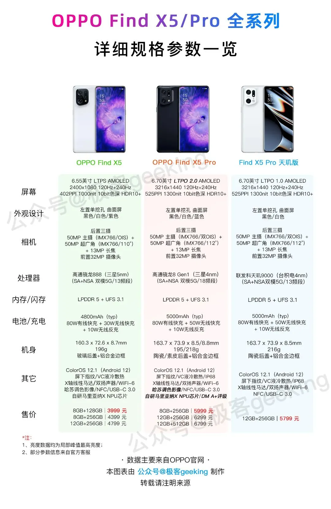 其中 OPPO Find X5 Pro 系列发布于 2022 年初,分别搭载骁龙8 Gen1 和天玑9000 芯片,附上 OPPO Find X5/Pro 系列三款旗舰手机的一张图配置完全总结如下: