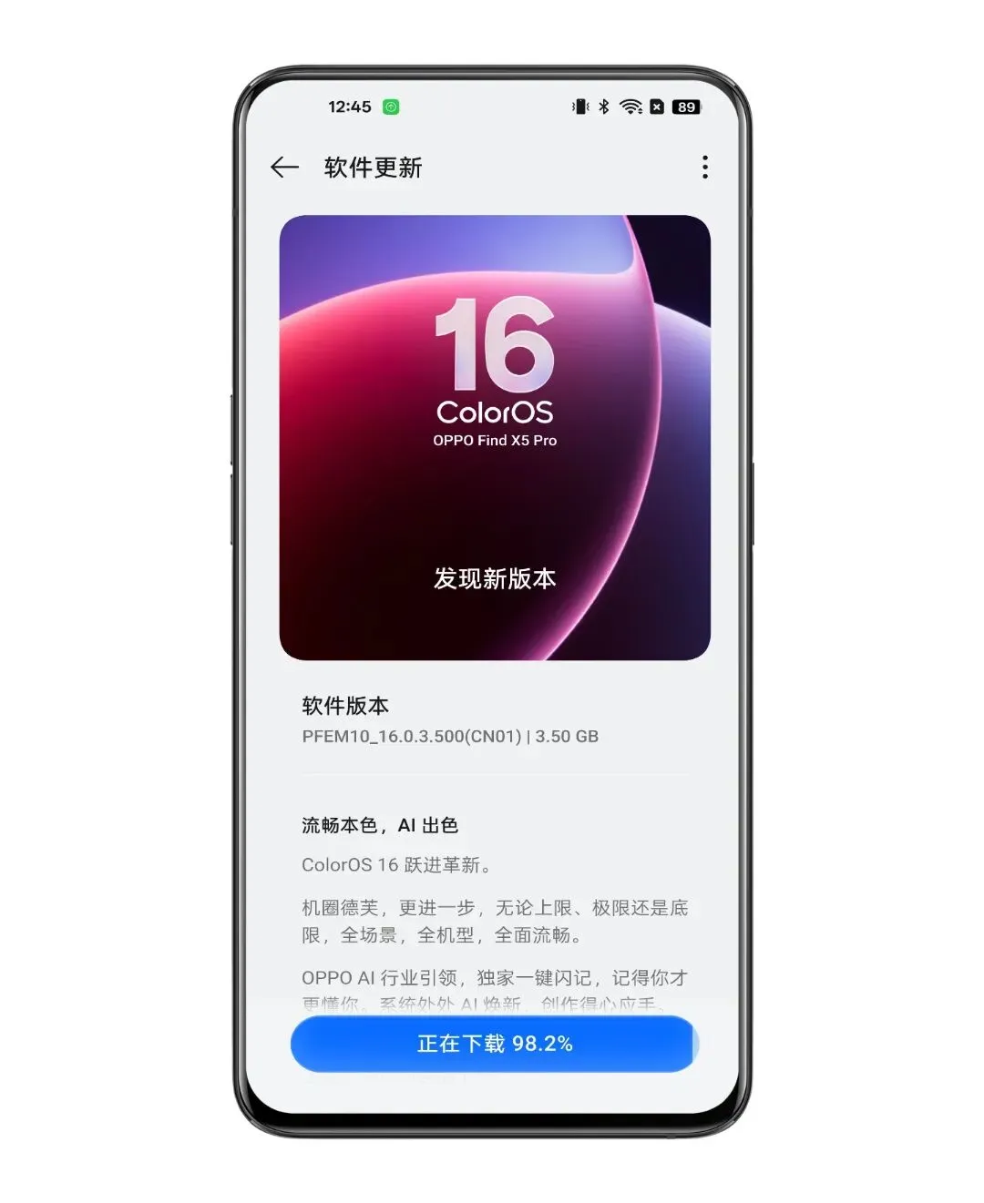 目前上述名单中已经有手机收到了 ColorOS 16 的正式版升级,比如 OPPO Find X5 Pro 骁龙版,首个版本是 16.0.3.500,OTA 升级包体积为 3.50GB。