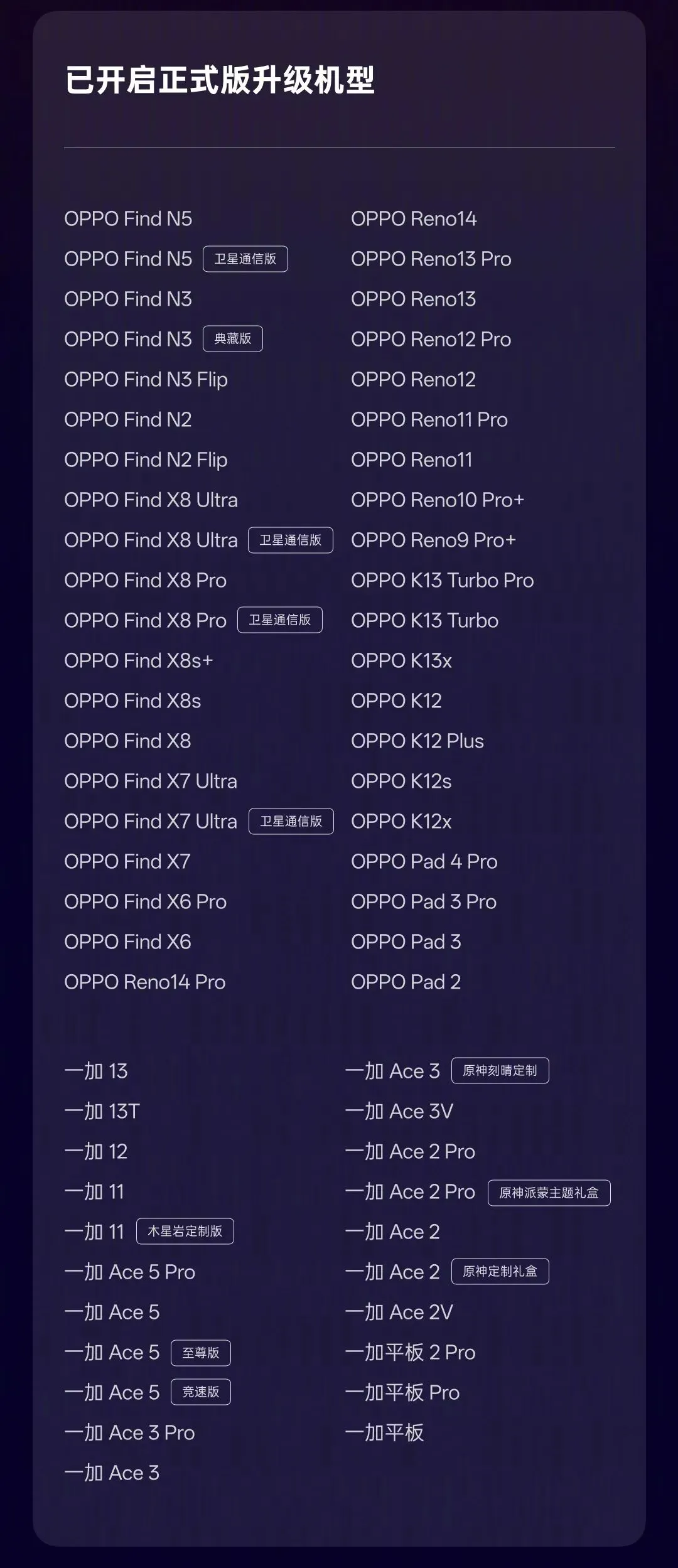 那么截至目前,ColorOS 16 都升级支持了哪些 OPPO 和一加的手机和平板设备?官方总结了完整的已升级机型名单如下: