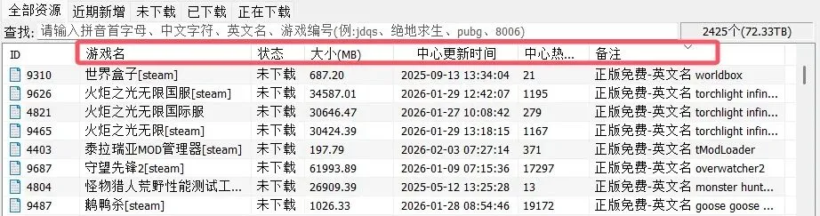 在游戏列表中也列出了各个游戏的名称,下载状态、游戏大小、更新时间、游戏热度等具体信息,方便用户选择。