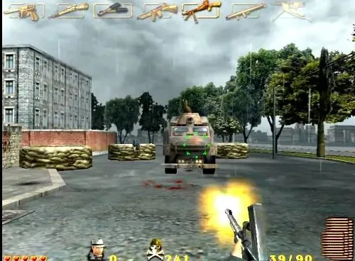 进入里面的广场,要对付每栋楼上众多鬼子,用冲锋枪容易解决他们,第三栋楼最后同时出来六个鬼子,火箭筒打其实不方便,用轻机枪可以一次扫死一排的。最后的BOSS是一辆97式坦克,难度很大,只能利用火箭筒和手榴弹来对付,边上的鬼子用冲锋枪和轻机枪对付,主角自动利用掩体保护自己,中途有一次机会补充弹药,还可以捡到几个医药包,坦克向你冲来的时候,全力开火会把它打回去,坚持它转两个圈后,你的弹药耗尽,跑到左边的防护栏架起重机枪继续攻击,不停的打坦克,有鬼子出来打鬼子,耐心和敌人周旋就能取胜了。