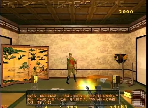 打完这里,请一定把鼠标移到正中间。接下来是本游戏最终的BOSS长谷川清大将,只有一次机会,就一秒钟,不是你干掉他就是被他干掉,这里请真的提起十二分精神,或者干脆从他说话开始,就对着这个狡猾的鬼子不停的按开火吧。